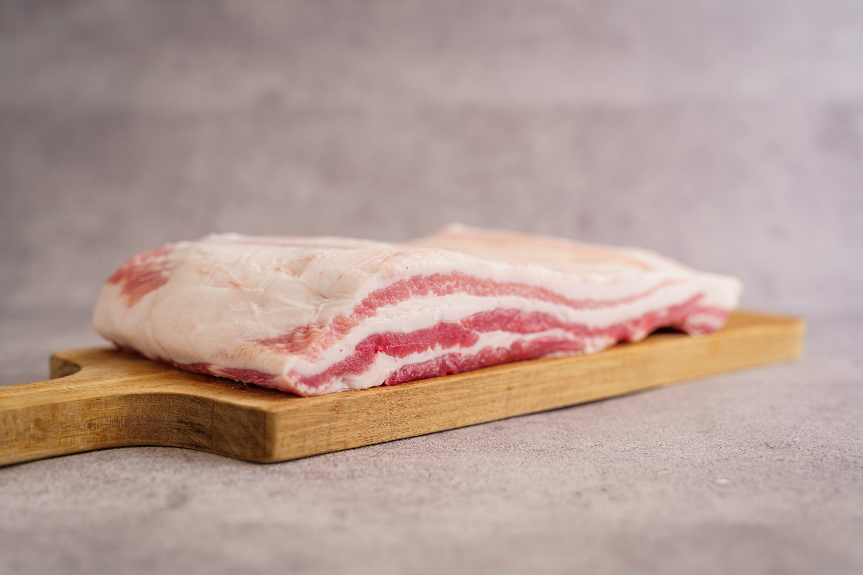 豚の腹側にある部位。赤身と白身(脂)が層になる柔らかい肉質がバラの特徴です。きれいな脂の甘みを感じていただけたらと思います。
